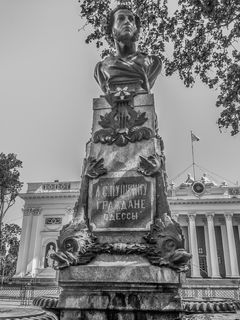 Der große russische Dichter Aleksandr Sergeevič Puškin (Alexander Puschkin, 1799-1837) lebte in den Jahren 1823/1824 in Odessa, wenn auch anfangs nicht ganz freiwillig: Er war, wie ein Jahr später der polnische Dichterfürst Adam Mickiewicz (1798-1855), in den „staubigen Süden“ verbannt worden und begann hier mit der Arbeit an seinem Meisterwerk Eugen Onegin. Die Schriftstellerinnen Anna Andreevna Achmatova (Anna Achmatowa, 1889-1966) und Vera Michajlovna Inber (1890-1972) wurden in Odessa geboren. Osip Aronovič Rabinovič (1817-1869) gab in Odessa die erste russischsprachige jüdische Zeitung heraus (Rassvet 1860-1861). Mit seinem Roman Kalejdoskop begründete er die russisch-jüdische literarische Tradition. Jakov Petrovič Polonskij (1819-1898) schilderte 1879 seine Eindrücke aus Odessa in dem Roman Deševij Gorod (Die billige Stadt). Der junge Maksim Gor’kij (Maxim Gorki, 1868-1936) machte bei seinen Wanderungen durch Russland 1891 in Odessa Station, wo er sich als Lastenträger im Hafen verdingte. In seiner Erzählung Čelkaš (Tschelkasch, 1895) vermittelte er ein authentisches Bild der schwierigen Arbeitsbedingungen im Odessaer Hafen.