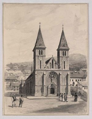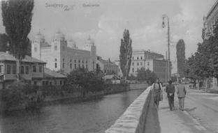 Durch die Initiativen von Benjámin von Kállay (1839–1903), Reichsfinanzminister und Zivilverwalter von Bosnien-Herzegowina, wurde Sarajevo zum wirtschaftlichen, kulturellen und politischen Zentrum Bosniens. Als eine der ersten europäischen Städte erhielt Sarajevo 1895 eine elektrische Straßenbahn. Des Weiteren veranlasste Kállay den Bau eines Zentralbahnhofs. Die Ansiedlung neuer Fabriken, darunter die noch heute existierende Tabakfabrik, führte zu einer Belebung der Wirtschaft. Das Gesicht der neuen Landeshauptstadt wurde maßgeblich durch die zahlreichen öffentlichen und sakralen Gebäude geprägt, die von Josip Vancaš (1859–1932) und Karel Pařík (1857–1942) entworfen wurden.[6] Dazu zählen der Sitz der Provinzregierung (1886), die römisch-katholische Herz-Jesu-Kathedrale (1889), die evangelische Kirche (1898–1899), das Vereinshaus (1897–1898) und die Synagoge der Aschkenasim (1902).