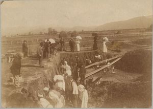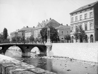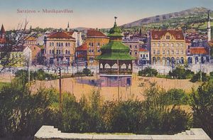 Sarajevo erhielt 1883 eine begrenzte Autonomie als Landeshauptstadt. Die 24 Sitze im Stadtrat wurden mittels Proporz auf die verschiedenen Konfessionen verteilt, wobei zwölf Sitze an die Muslime gingen, sechs an die Orthodoxen und je drei an die Katholiken und Juden.[7] Um der zunehmenden Nationalisierung der serbisch-orthodoxen und römisch-katholischen Religionsgemeinschaften und den damit verbundenen Einflüssen aus den Nachbarstaaten (vor allem Serbien) entgegenzuwirken, versuchte Kállay das Konzept einer multikonfessionellen „bosniakischen Nation“ („Bošnjaštvo”) zu implementieren.[8] Diese Idee konnte sich jedoch nicht durchsetzen, da die konfessionell definierten Nationalbewegungen an Einfluss gewannen. Die Annexion Bosnien-Herzegowinas am 5. Oktober 1908 eskalierte die Krise zwischen Serbien und Österreich-Ungarn. In Sarajevo organisierten zahlreiche Mitglieder der revolutionären Vereinigung Junges Bosnien (Mlada Bosna) Proteste gegen die Annexion. Unter ihnen befand sich auch Gavrilo Princip (1894–1918), der am 28. Juni 1914, dem Vidovdan (Veitstag, ein zentraler Gedenktag der Serben), den österreich-ungarischen Thronfolger, Erzherzog Franz Ferdinand und dessen Gemahlin, Sophie Chotek, Herzogin von Hohenberg, während ihres Besuchs in Sarajevo an der Lateinerbrücke (Latinska ćuprija) erschoss.[9] Noch am selben Abend sowie am darauffolgenden Tag kam es in der Stadt zu pogromartigen antiserbischen Ausschreitungen.