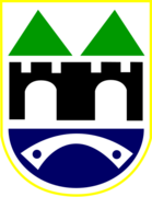 Das heutige Wappen zeigt im oberen Drittel zwei grüne Dreiecke auf weißem Grund, die die umliegenden Berge symbolisieren, in der Mitte zwei schwarze Stadttore, darunter einen blauen, von einer weißen Brücke überspannten Fluss.