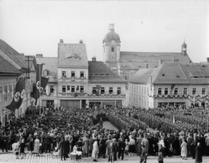 Im Münchner Abkommen vom 29./30. September 1938 legten das Deutsche Reich, Italien, Großbritannien und Frankreich die Abtretung der mehrheitlich von Deutschen besiedelten Randgebiete der Tschechoslowakei an das Deutsche Reich fest. Am 1. Oktober 1938 begann die Besetzung durch die Wehrmacht. Die das deutsche Parteiensystem seit den tschechoslowakischen Parlamentswahlen von 1935 dominierende „Sudetendeutsche Partei“ (SdP) ging in der NSDAP auf, Gauleiter des NSDAP-Gaus Sudetenland wurde der frühere SdP-Führer Konrad Henlein (1898–1945). Ehemalige SdP-Mitglieder konnten eine Aufnahme in die NSDAP beantragen. Von 1938 bis Kriegsende waren rund 528.000 Menschen in der NSDAP Sudetenland organisiert, damit war der „Parteigau“ – gemessen an der Zahl der wahlberechtigten Bevölkerung – der mitgliederstärkste im Deutschen Reich.[1]